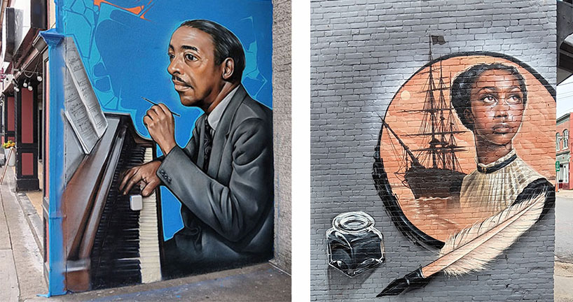 NEW MURALS IN DOWNTOWN PAWTUCKET Several new murals have recently appeared on buildings in downtown Pawtucket. The murals, painted by Lee Beard (Soems,) depict historical Black personalities. The murals were funded by a RI Commerce grant awared to the Black Block Community Foundation.